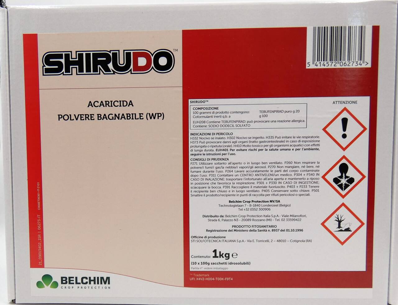 Acaricida a base di Tebufenpyrad efficace contro uova, larve, ninfe e adulti di Tetranichidi, Tarsonemidi ed Eriofidi. SHIRUDO è caratterizzato da elevata efficacia con rapido effetto abbattente ed elevata persistenza di azione, agisce per contatto ed ingestione bloccando la produzione di energia a livello cellulare. Distribuito per applicazione fogliare, è translaminare e la sua attività non è influenzata dalla temperatura, quindi risulta di versatile utilizzo. SHIRUDO è selettivo verso gli insetti utili e gli impollinatori.