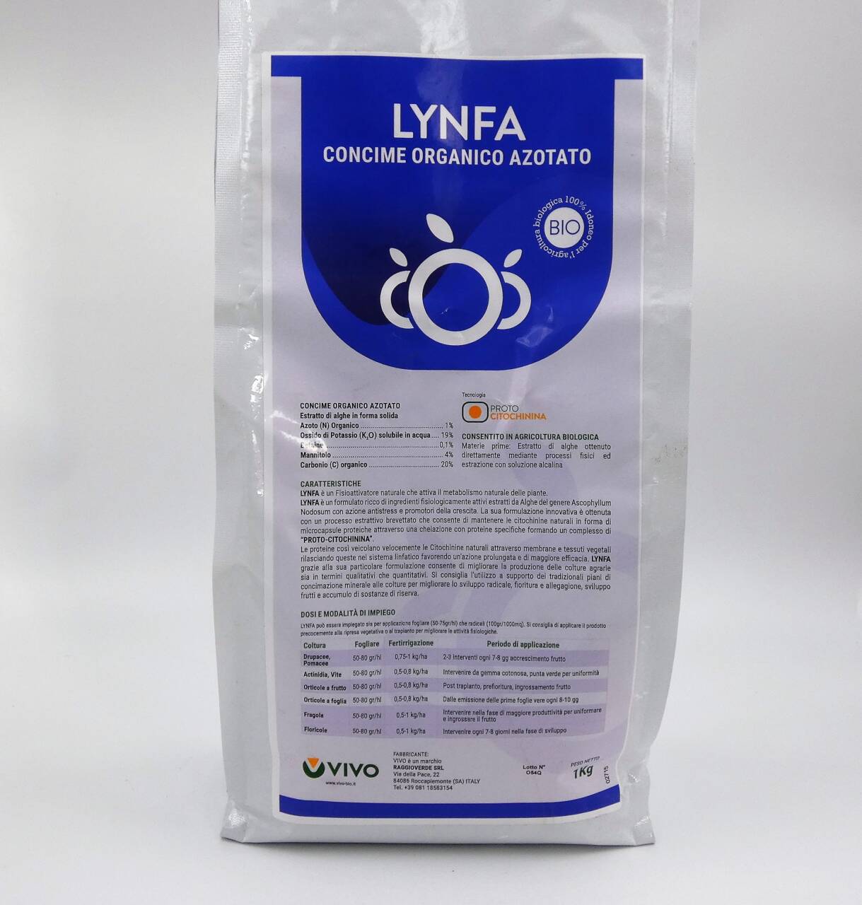 è un biopromotore, interamente di origine vegetale, a base di Ascophyllum nodosum, un’alga ricca di ingredienti fisiologicamente attivi come betaine, citochinine, e polisaccaridi e promotori della crescita naturali. Le proprietà nutrizionali e il processo di lavorazione, rendono LYNFA un prodotto ricchissimo di sostanze biologicamnete attive che svolgono una efficace attività antistress e una azione sui processi di allegagione e sviluppo frutti.